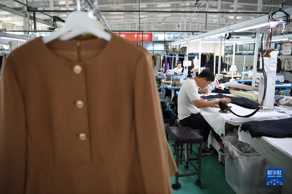 9月20日,在位於南宮市的河北鴻熙服裝股份有限公司,工人在熨燙服裝。