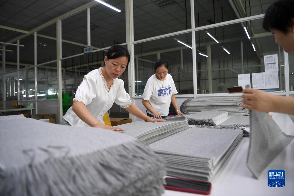 9月20日,安美橋(南宮)羊絨製品有限公司的工人在包裝用於出口的羊絨圍巾。