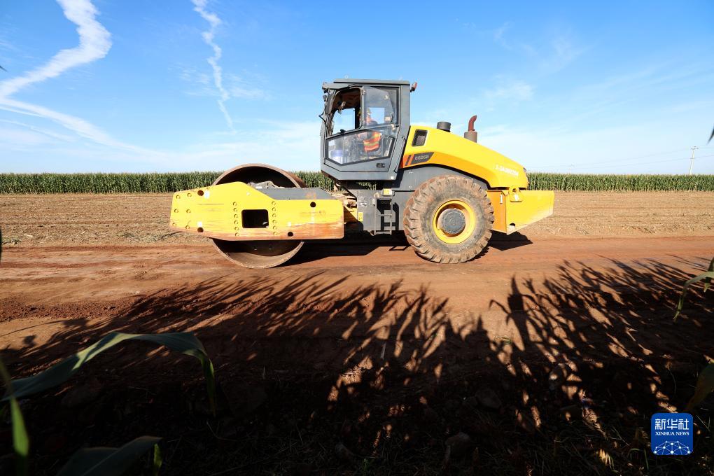 9月20日,工人駕駛機械在河北省石家莊市行唐縣南橋鎮東市莊村一處連村公路工地施工。