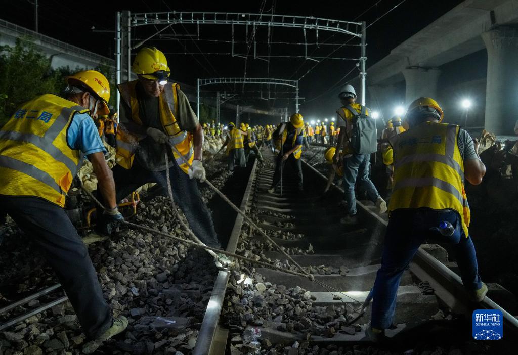 9月19日夜晚,施工人員在滬昆鐵路上海七寶至春申段線路上作業。