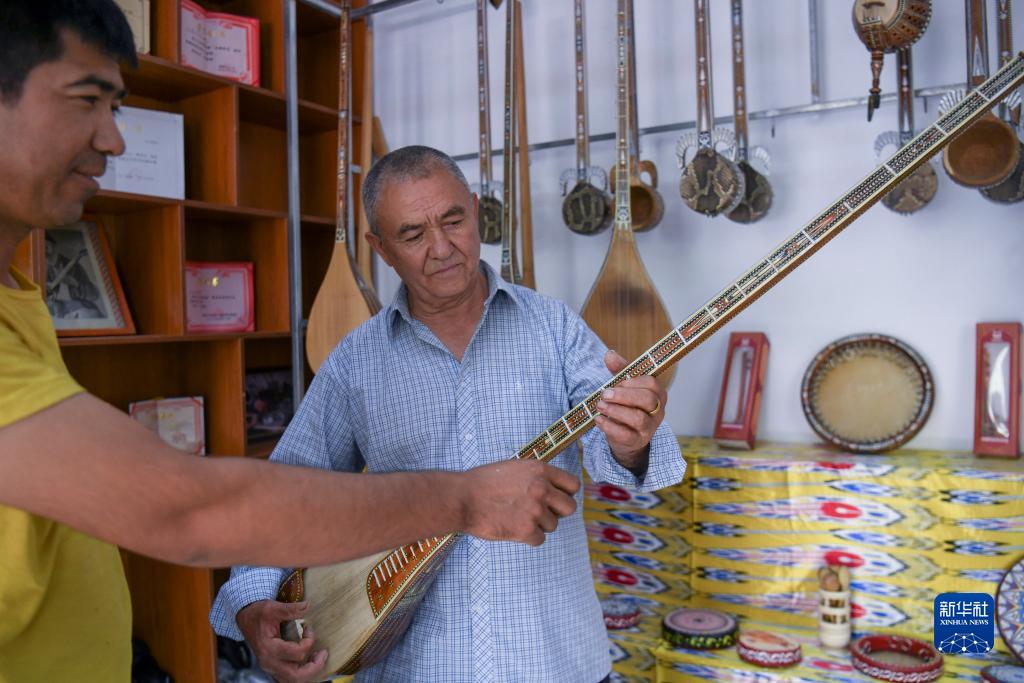 在“樂器村”民族樂器作坊,國家級非物質文化遺産項目民族樂器製作技藝代表性傳承人熱合曼·阿布都拉(右)在向兒子馬穆提·熱合曼傳授民族樂器製作技藝(9月15日攝)。
