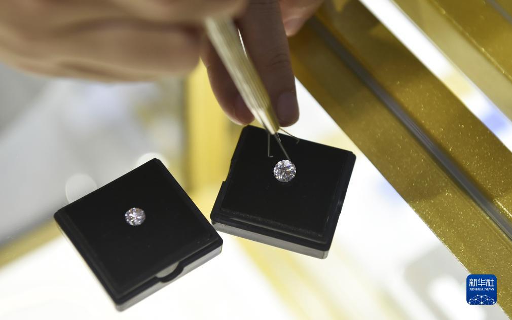 9月20日,在鄭州國際會展中心,參展企業的工作人員展示培育鑽石。