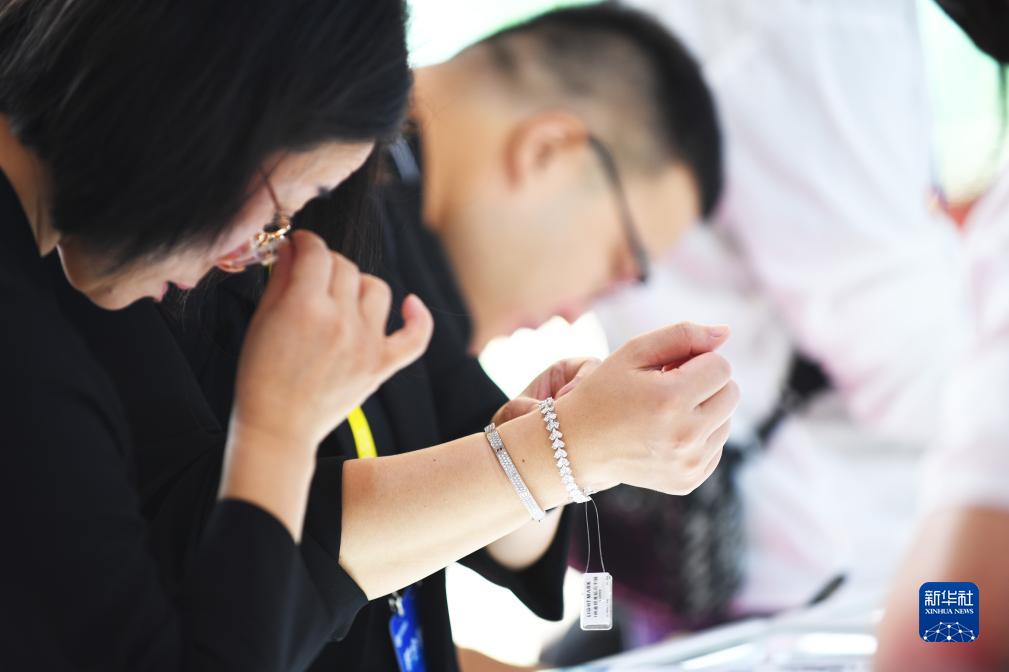 9月20日,觀眾在鄭州國際會展中心試戴鑽石首飾。
