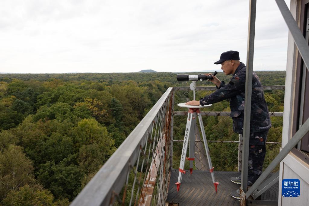 長白山國家級自然保護區,瞭望員王孝華正在瞭望&上值守(9月16日攝)。進入森林防火期後,他天一亮就登上瞭望&觀測,直至天黑才下&休息。