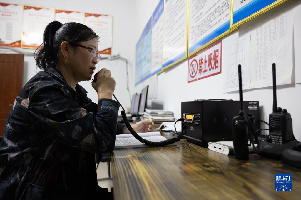 在長白山國家級自然保護區管理局頭西保護管理站,電台員魏長娟正在與巡護員&&,了解野外巡護情況(9月17日攝)。
