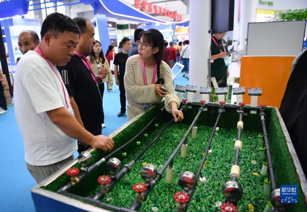 9月21日,工作人員(右一)向參觀者介紹一款節水灌溉設備。