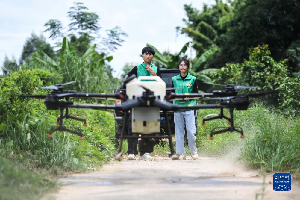 9月13日,位於廣州市增城區石灘鎮石湖村一處機耕路上,沈笑芬(右)操作農用無人機起飛。