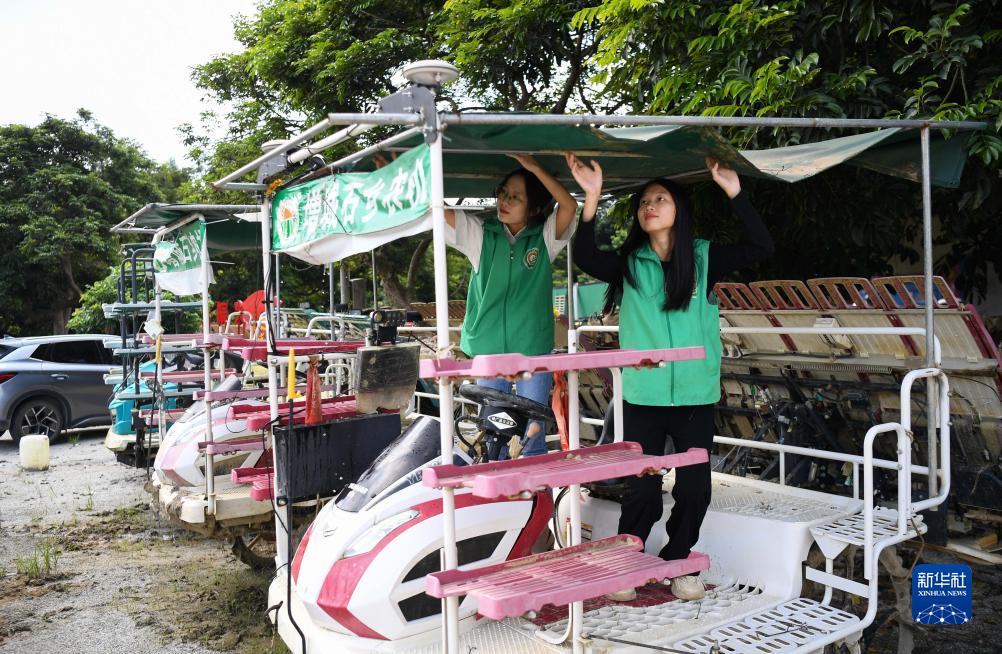 9月18日,在廣州市增城區石灘鎮石湖村的石鄉農機專業合作社,連日大雨後,沈燕芬(左)和沈笑芬清理農機遮陽棚。