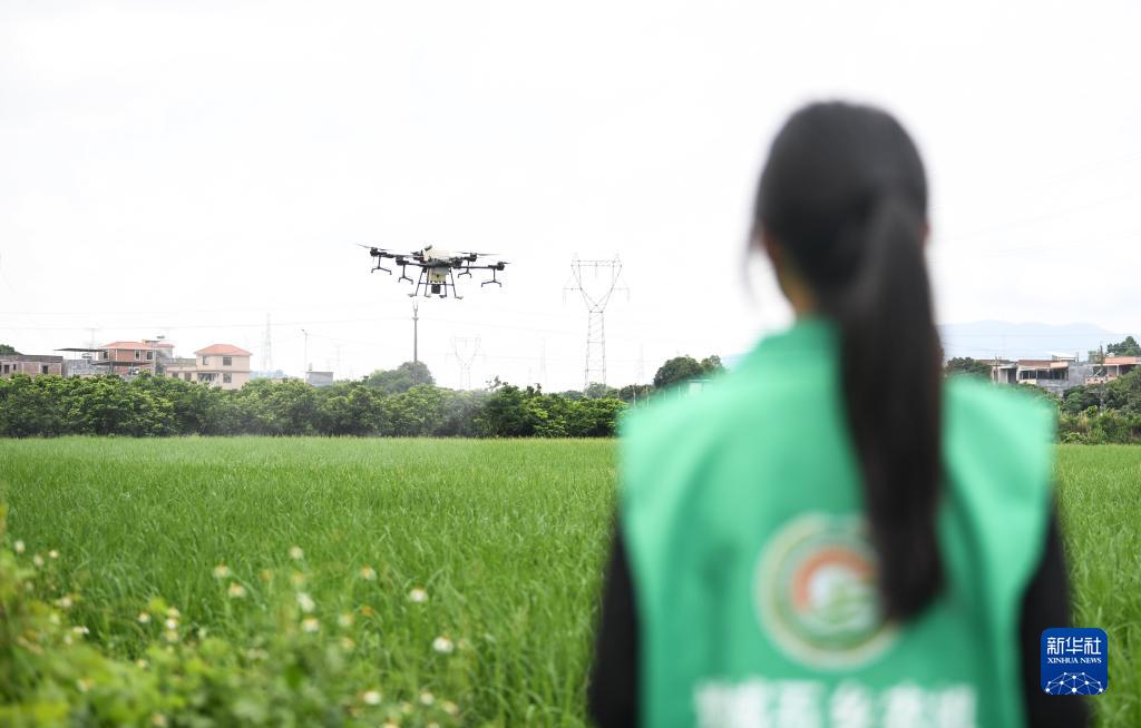 9月13日,在廣州市增城區石灘鎮石湖村,沈笑芬操作農用無人機噴灑農藥。