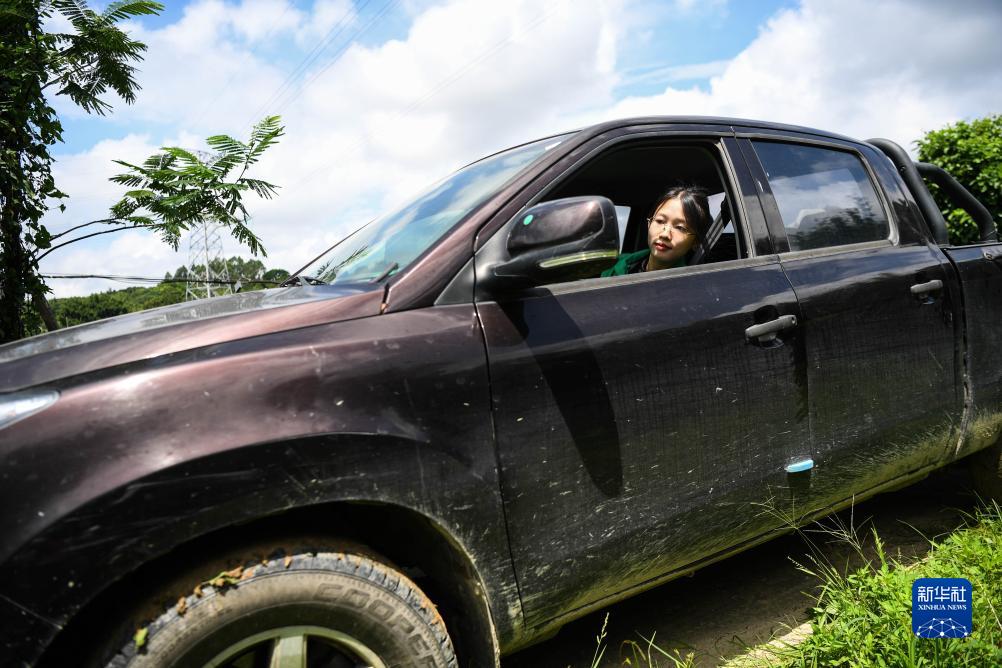9月13日,位於廣州市增城區石灘鎮石湖村,沈笑芬在機耕路上邊駕駛工作車,邊觀察道路。