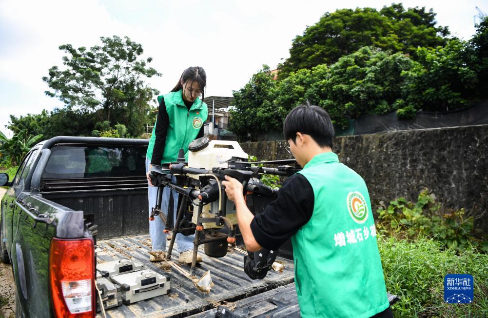 9月13日,位於廣州市增城區石灘鎮石湖村的一處機耕路上,沈笑芬(左)從車上搬下農用無人機。