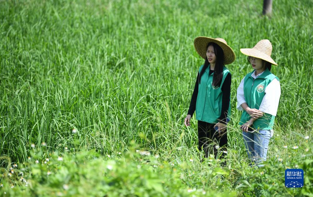 9月18日,在廣州市增城區石灘鎮石湖村一處農田,沈燕芬(右)和沈笑芬查看禾苗長勢。