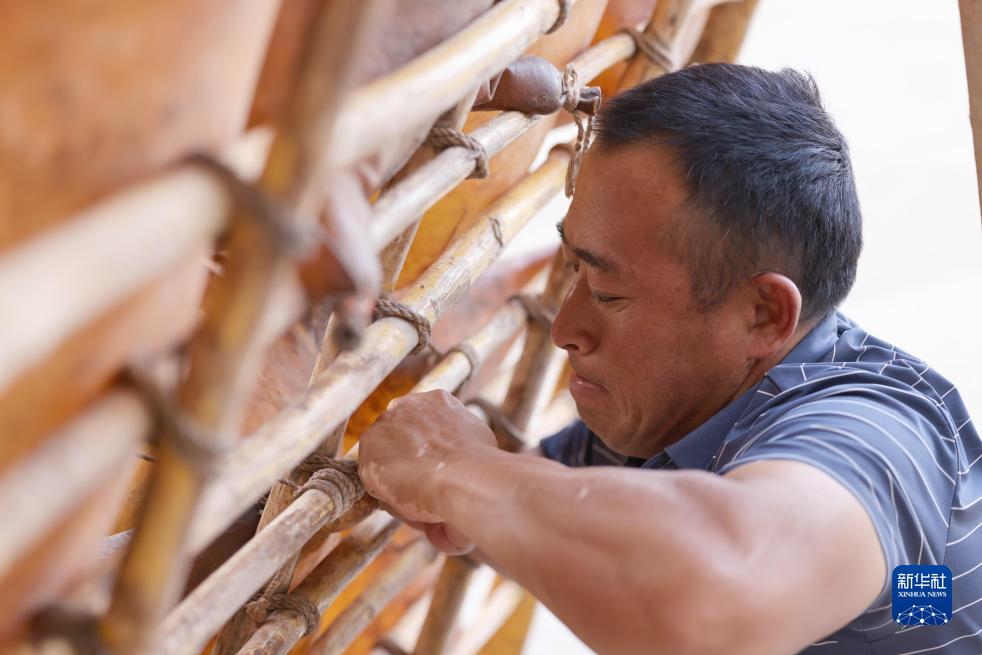 牛強在維修保養羊皮筏子(9月5日攝)。