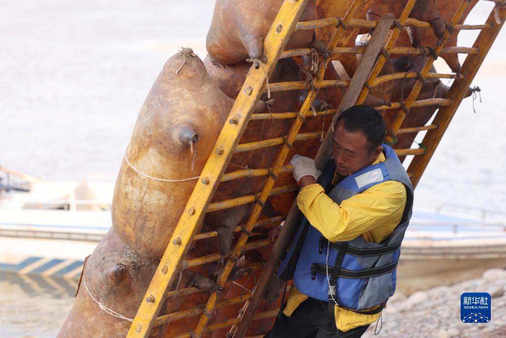 牛強在搬運羊皮筏子(9月5日攝)。