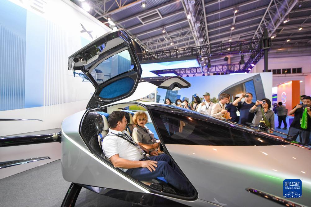 9月21日,在2023世界智能網聯汽車大會室內展區,兩位參觀者在參觀小鵬飛行汽車。