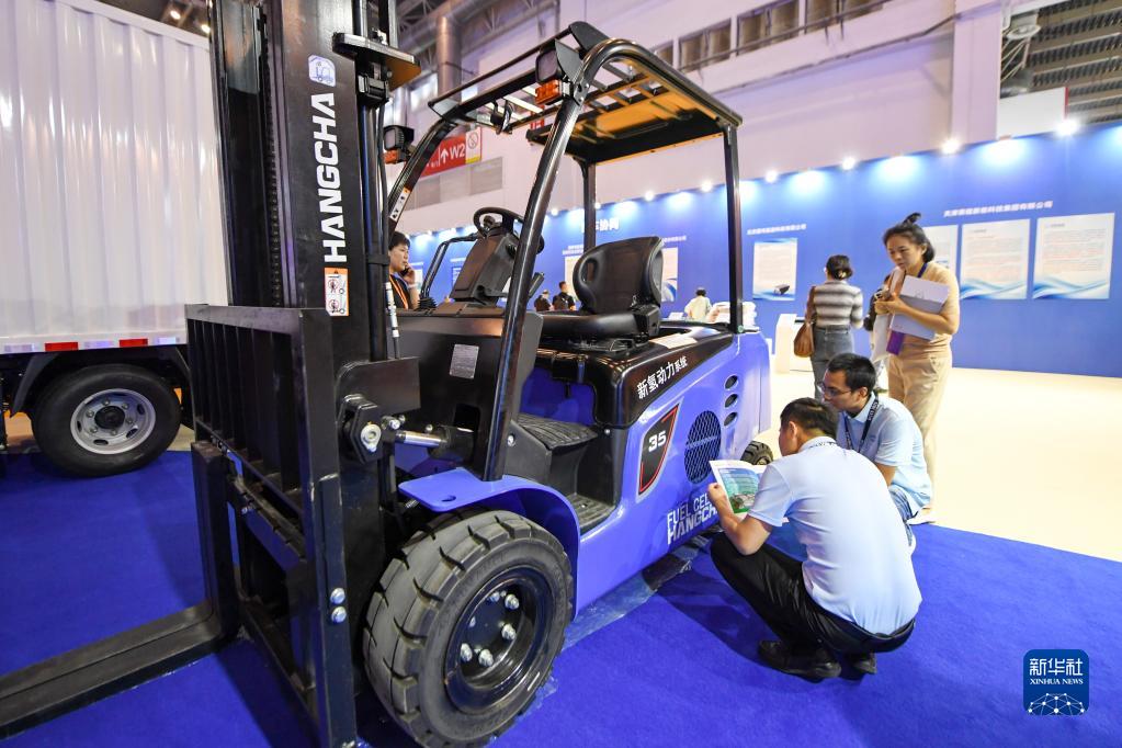 9月21日,在2023世界智能網聯汽車大會室內展區,參觀者在參觀一輛氫燃料電池叉車。