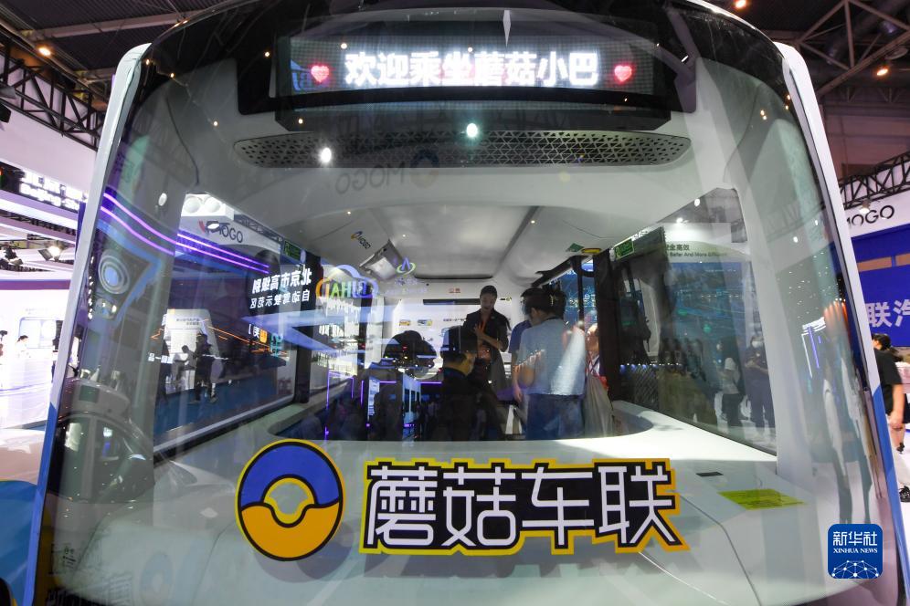 9月21日,在2023世界智能網聯汽車大會室內展區,參觀者在參觀一輛無人駕駛小巴車。