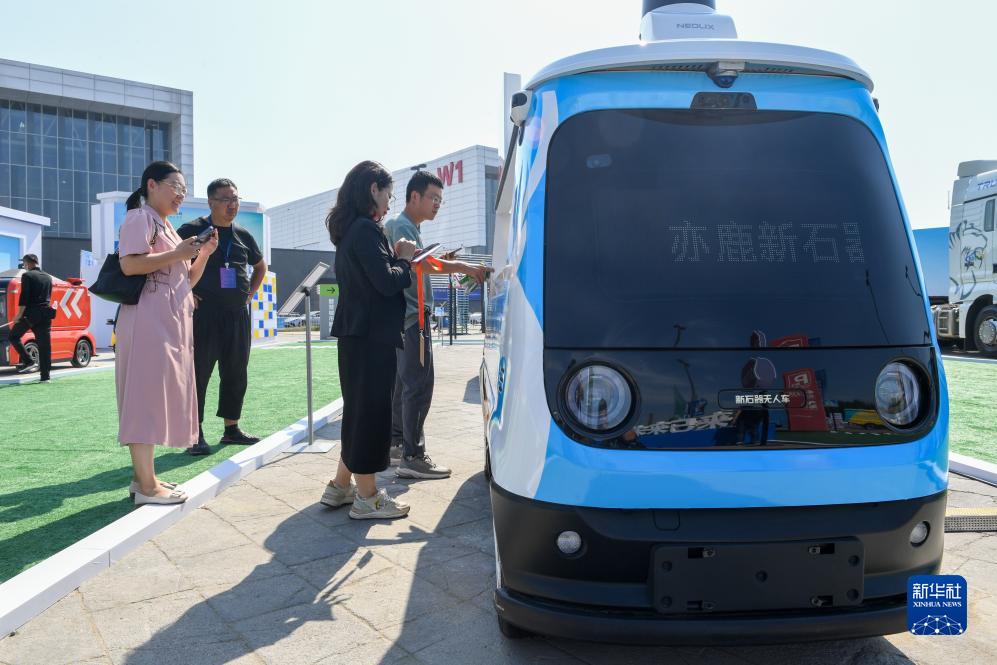 9月21日,在2023世界智能網聯汽車大會室外展區,幾位參觀者在一輛無人零售車前體驗購買商品。