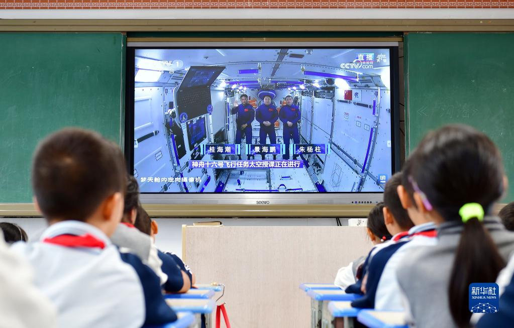 “天宮課堂”第四課在中國空間站正式開講,神舟十六號航天員景海鵬、朱楊柱、桂海潮進行授課。本次太空授課活動繼續採取天地互動方式進行,共設立北京航空航天大學等5個地面課堂。3名航天員將在軌展示介紹中國空間站夢天實驗艙工作生活場景,演示球形火焰實驗、奇妙“乒乓球”實驗、動量守恒實驗以及又見陀螺實驗,並與地面課堂進行互動交流。