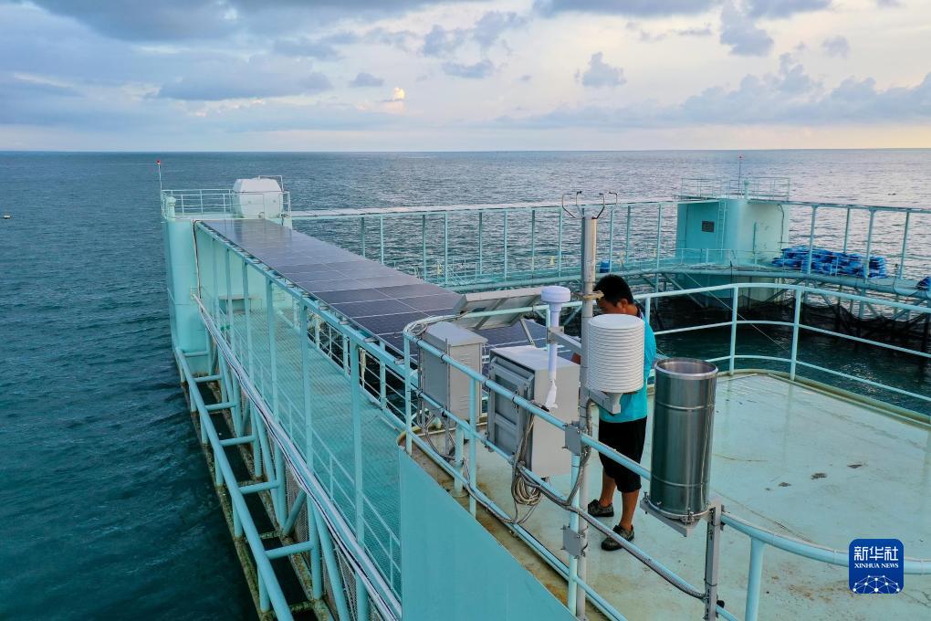 飼養管理員檢查“海威2號”上的水文、氣象監測與預測系統設備(無人機照片,9月20日攝)。