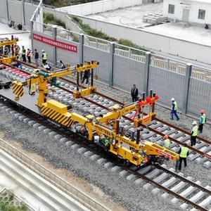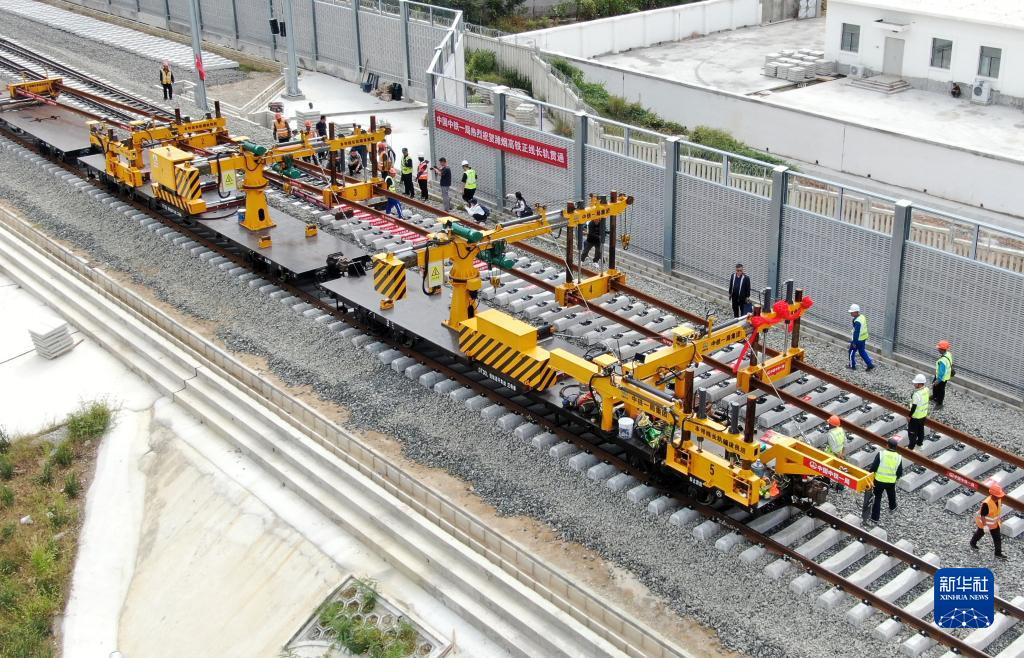 9月21日,中鐵一局建設者採用我國自主研發的新型智能本鄰兩線鋪軌機組進行鋪軌作業,該機組可實現跨線鋪軌,使高鐵線路軌道鋪設更加高效(無人機照片)。