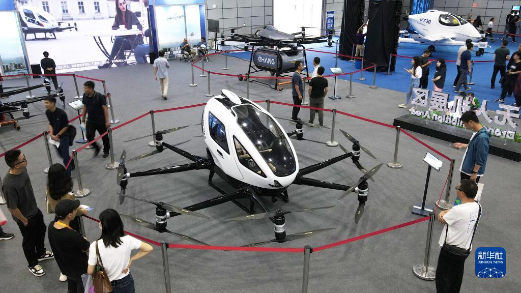 這是2023世界製造業大會上展出的載人級自動駕駛飛行器(9月21日攝,無人機照片)。