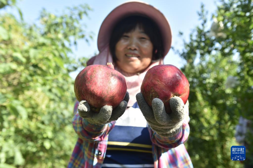 9月21日,村民在“拾榴花果山”農業生態園裏展示剛採摘的石榴。