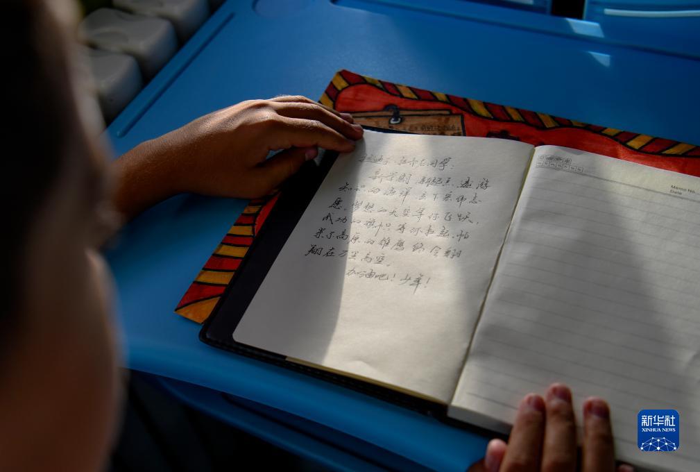 在新疆喀什第二中學,九年級學生拉迪爾·拉齊尼收到老師贈送的開學禮物(9月7日攝)。