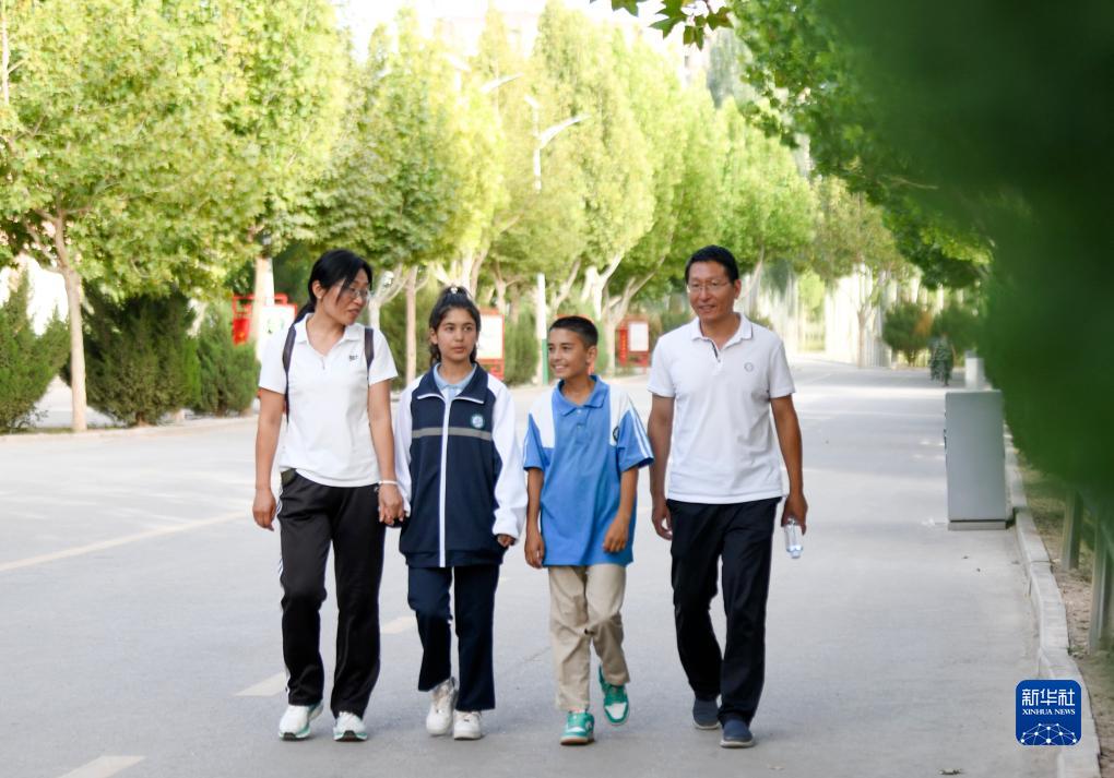在新疆喀什第二中學,來自山東省泰山中學的援疆副校長鞏玉兵(右一)和來自山東省東營市墾利第一中學的援疆教師尚玉傑(左一)與高二學生學生都爾汗·拉齊尼(左二)及其弟弟拉迪爾·拉齊尼(右二)一起走在整潔寬敞的校園中談心(9月7日攝)。