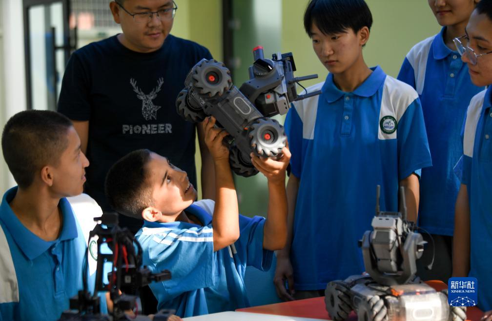 在新疆喀什第二中學,教師程應超(後)指導九年級的同學們學習機器人知識(9月7日攝)。