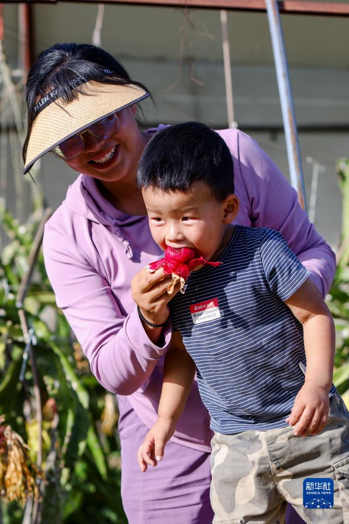 木壘縣博泰農業科技開發有限責任公司負責人朱娜給孩子品嘗試種的火龍果(9月20日攝)。