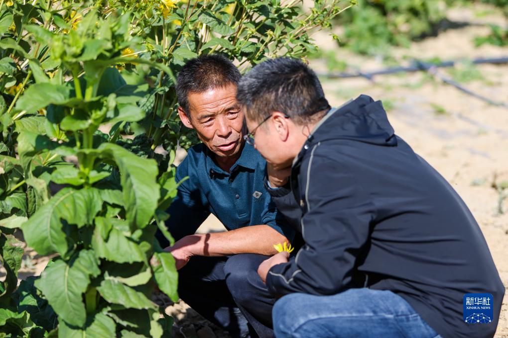 來自福建省南平市光澤縣農業農村局的援疆幹部呂軍(右)與新疆木壘生福生態農業發展有限公司負責人閆生福交流試種的大葉蛋白菊生長情況(9月20日攝)。