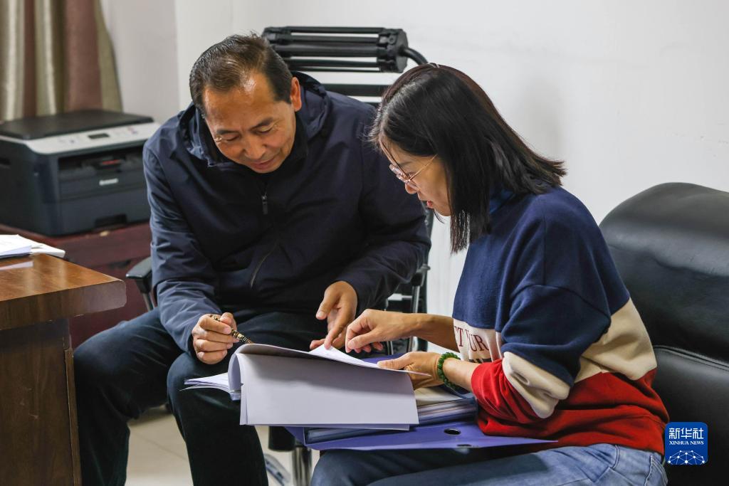 來自福建省漳州市農業農村局的黃素英(右)與當地幹部交流工作(9月20日攝)。