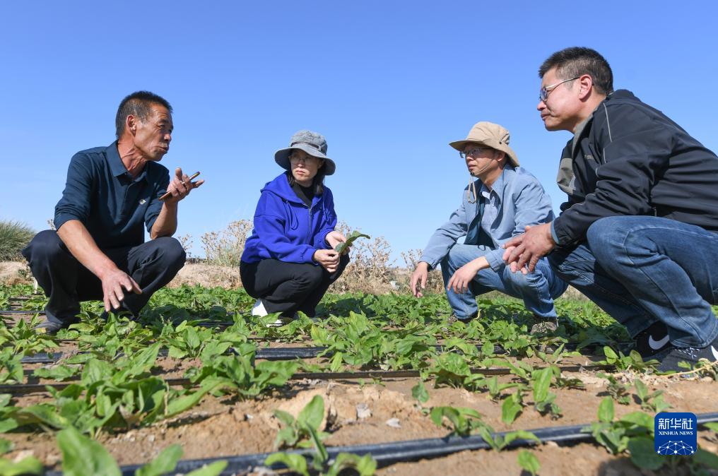 來自福建省南平市光澤縣農業農村局的援疆幹部呂軍(右一)、來自福建省武夷山市經濟作物技術站的援疆幹部黃文慶(右二)和來自福建省漳州市農業農村局的黃素英(左二),與新疆木壘生福生態農業發展有限公司負責人閆生福交流試種的大葉蛋白菊生長情況(9月20日攝)。