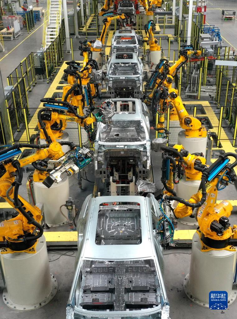 9月21日,在山東省青島市即墨區一家汽車製造企業的焊裝車間,機器人在進行焊接作業(無人機照片)。新華社發(梁孝鵬 攝)