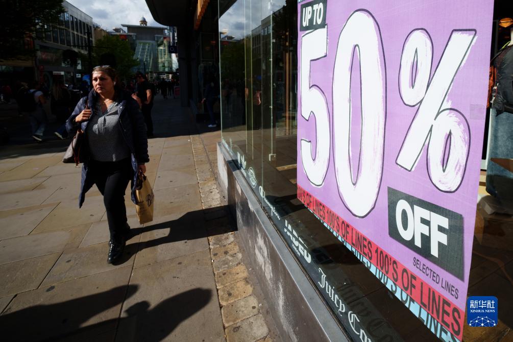 9月21日,在英國曼徹斯特,一名女子經過一家打折店舖。