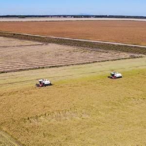 近日,“北大倉”黑龍江省進入秋收季,在墾區的水稻種植區,收割機械在田間忙碌收穫。