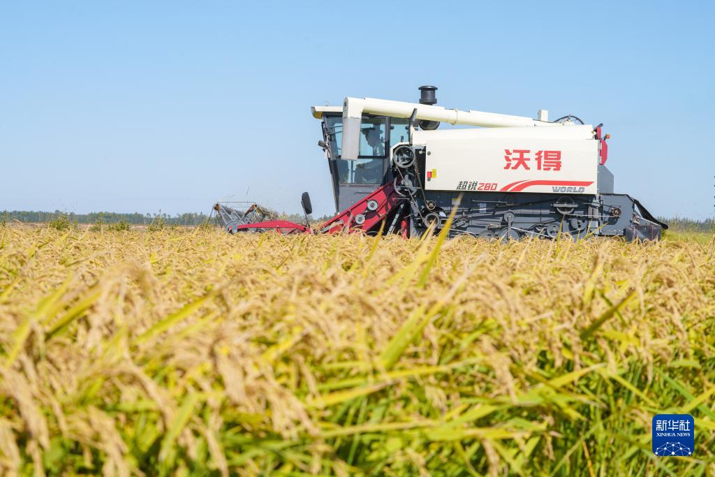 這是9月21日在位於雙鴨山市友誼縣的北大荒農業股份有限公司友誼分公司一地塊拍攝的水稻收穫現場。