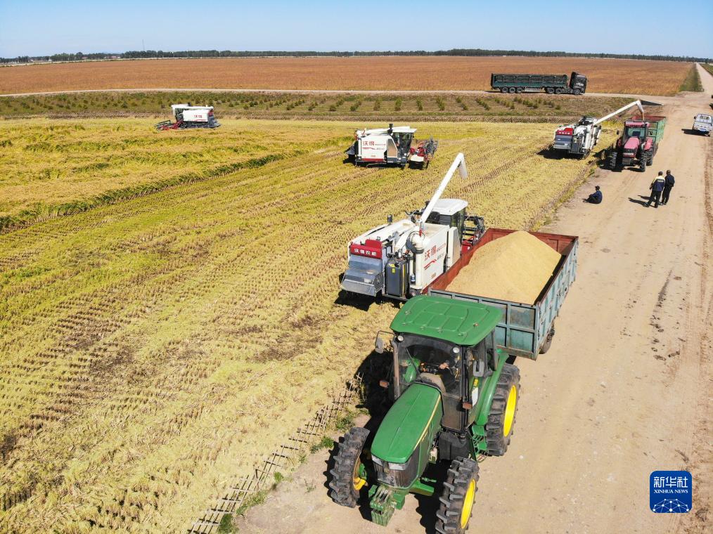 這是9月21日在位於雙鴨山市友誼縣的北大荒農業股份有限公司友誼分公司一地塊拍攝的水稻收穫現場(無人機照片)。