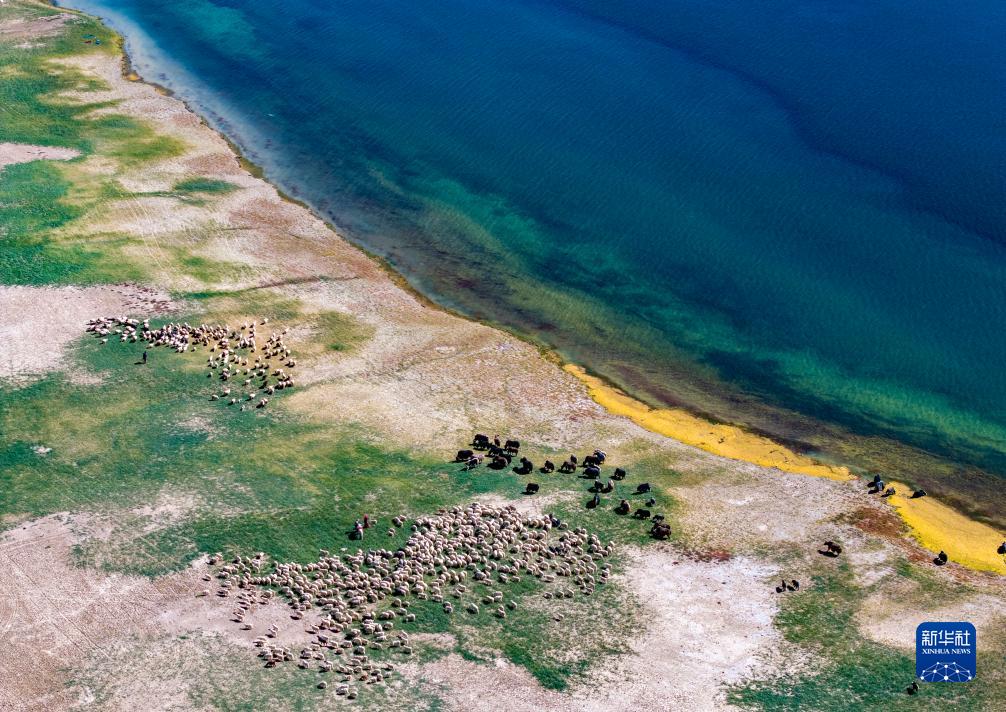 牧民在班公湖畔放牧(無人機照片,9月21日攝)。
