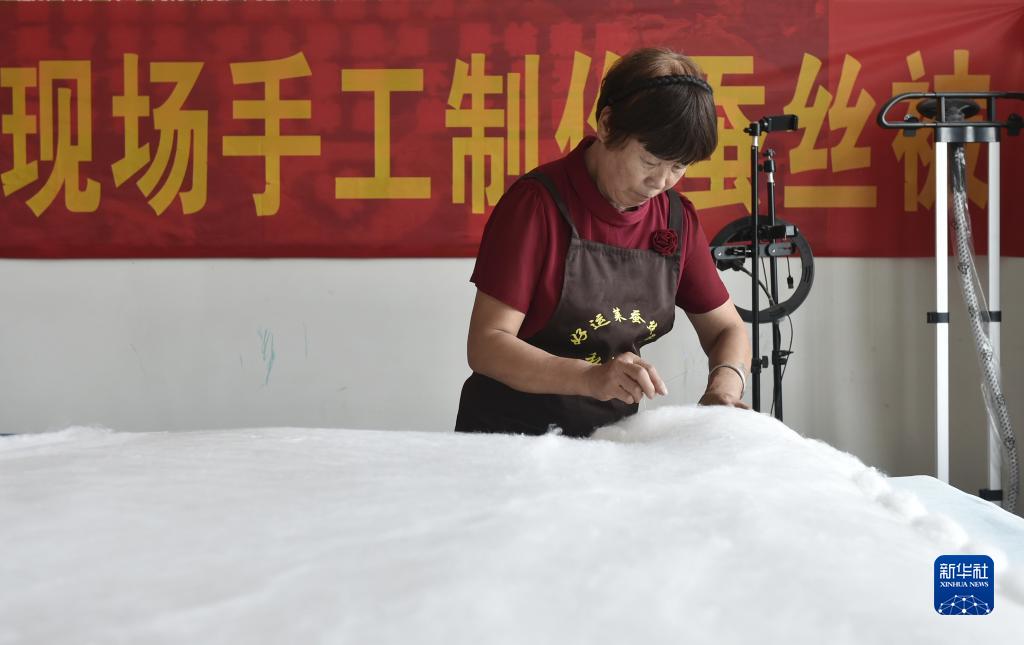 9月21日,在汝州市焦村鎮一家桑蠶産業公司,工作人員在手工製作蠶絲被。
