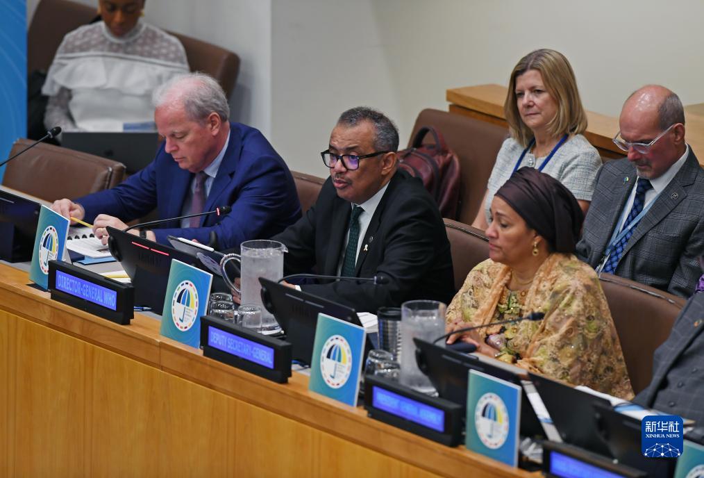 9月21日,在位於紐約的聯合國總部,世界衞生組織總幹事譚德塞(前排中)在第二次聯合國全民健康覆蓋問題高級別會議上講話。