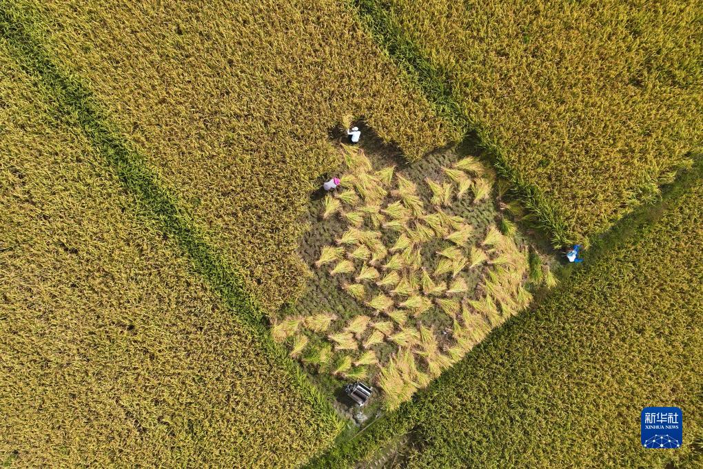 9月19日,重慶市黔江區馬喇鎮杉樹村村民在收穫貢米稻穀(無人機照片)。