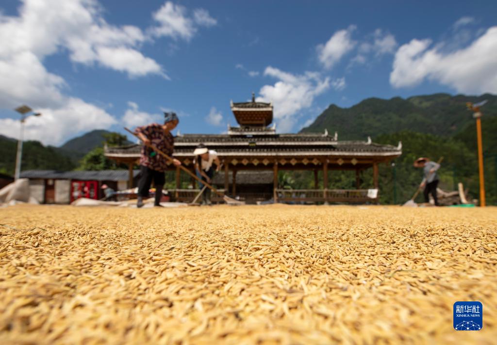 9月16日,村民在貴州省黔東南苗族侗族自治州從江縣剛邊壯族鄉三聯村晾曬稻穀。