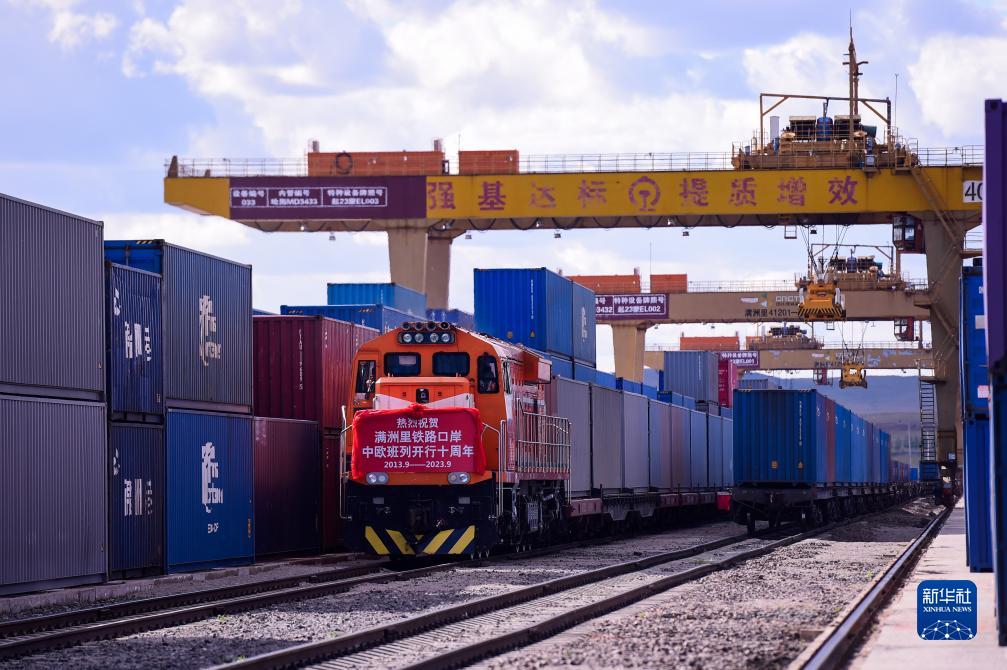 這是9月20日拍攝的滿洲裏站貨運車間集裝箱場內、換裝完畢的一列中歐班列。