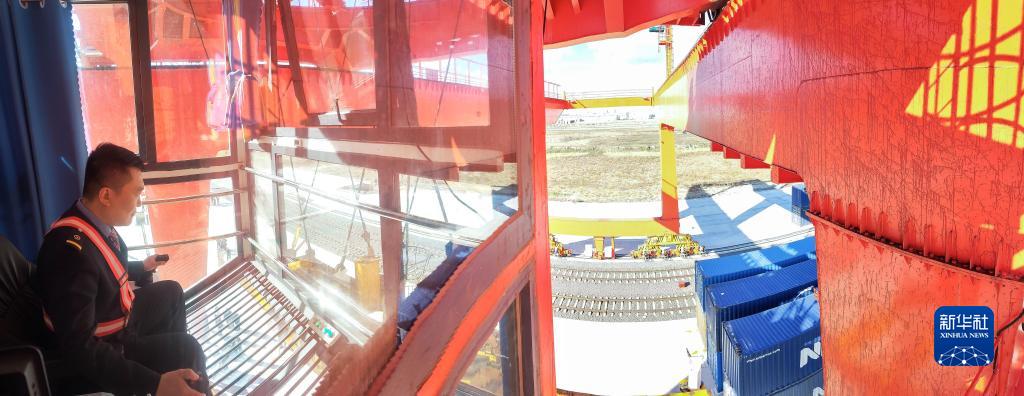 9月20日,滿洲裏站貨運車間集裝箱場工作人員使用龍門吊進行吊裝作業(全景照片)。