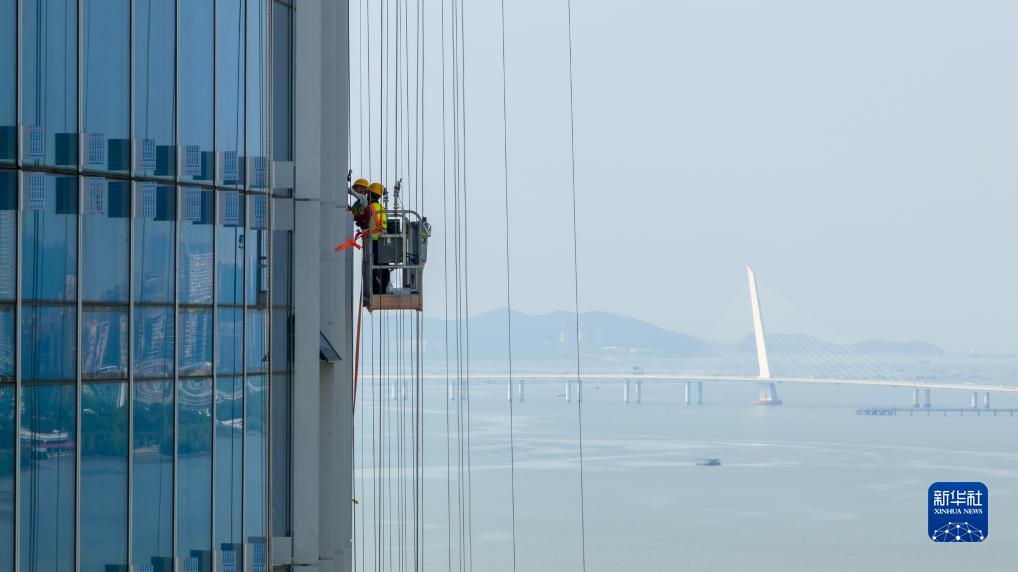 在中國電子集團深圳灣總部基地建設現場,工人在吊籃上進行外立面裝飾條安裝作業(無人機照片,9月22日攝)。