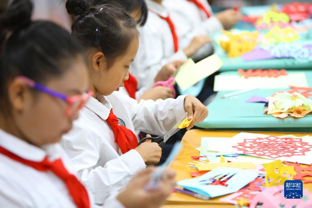 9月22日,孩子們在老師的帶領下創作豐收節的主題剪紙作品。