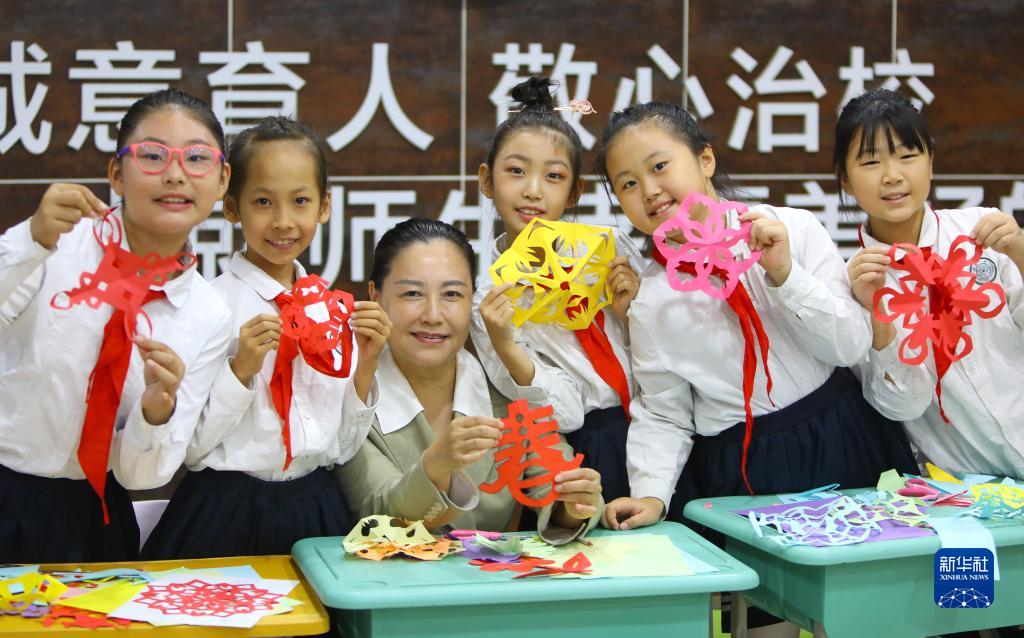 9月22日,孩子們和老師展示豐收節的主題剪紙作品。