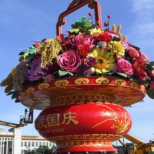 當日,“祝福祖國”巨型花籃主體亮相北京天安門廣場,花籃頂高18米,籃內首次選取了喜慶豐收的五穀(水稻、小麥、小米、黃米、大豆),結合具有美好寓意的花卉,體現花團錦簇、五穀豐登;籃體南側書寫“祝福祖國,1949-2023”字樣,籃體北側書寫“歡度國慶,1949-2023”字樣。